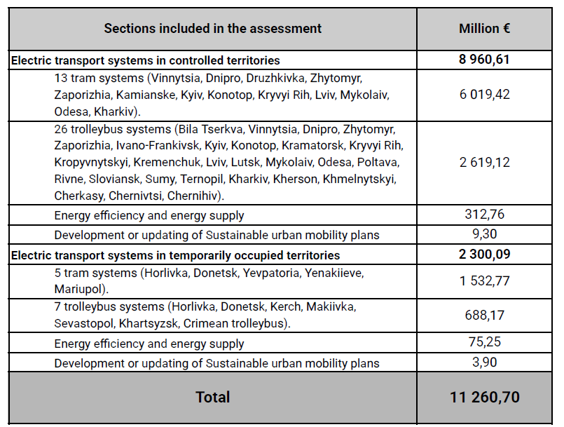 The NGO “Vision Zero” has presented an assessment of investment needs for the modernization of Ukraine’s urban electric transport, namely the trolleybus and tram systems. According to the study’s findings, the total amount of investment needed to upgrade these systems could be 11.260 billion euros.