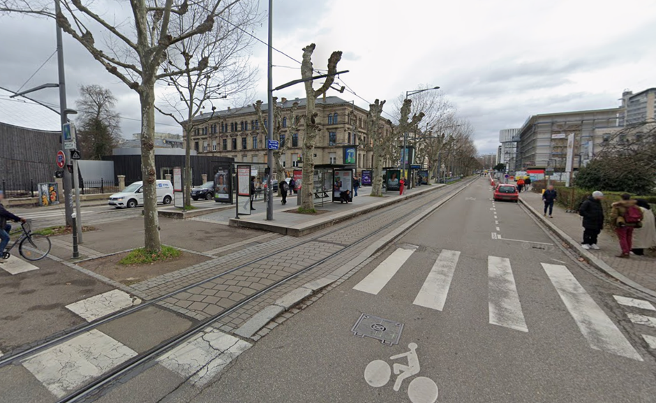 Бульвар de la Victoire (Перемоги) з 1 смугою в 1 напрямку. Станція “Університет” з острівною платформою в габариті бульвару. Фото – панорами Google Maps.