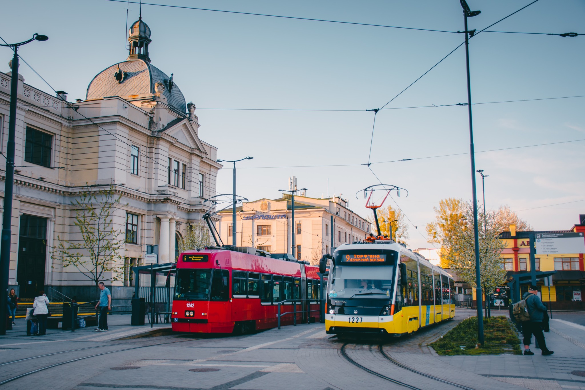 Трамваї Vevey та Електро́н T5L64 на Двірцевій площі м. Львова; фото: Володимир Караїм.